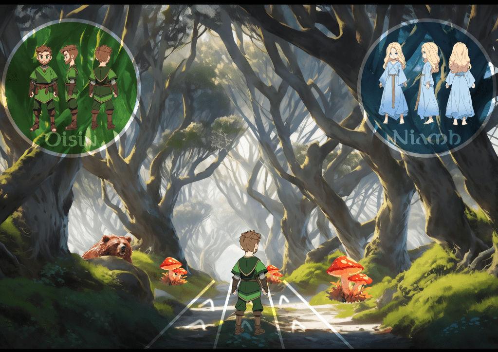 Concept boards for the First and Second levels. Created using AI generated assets. The first depicts level 1, in which Oisín travels through a forest as shown in the above gameplay footage. The second image depicts the journey across the ocean as part of the planned second level.